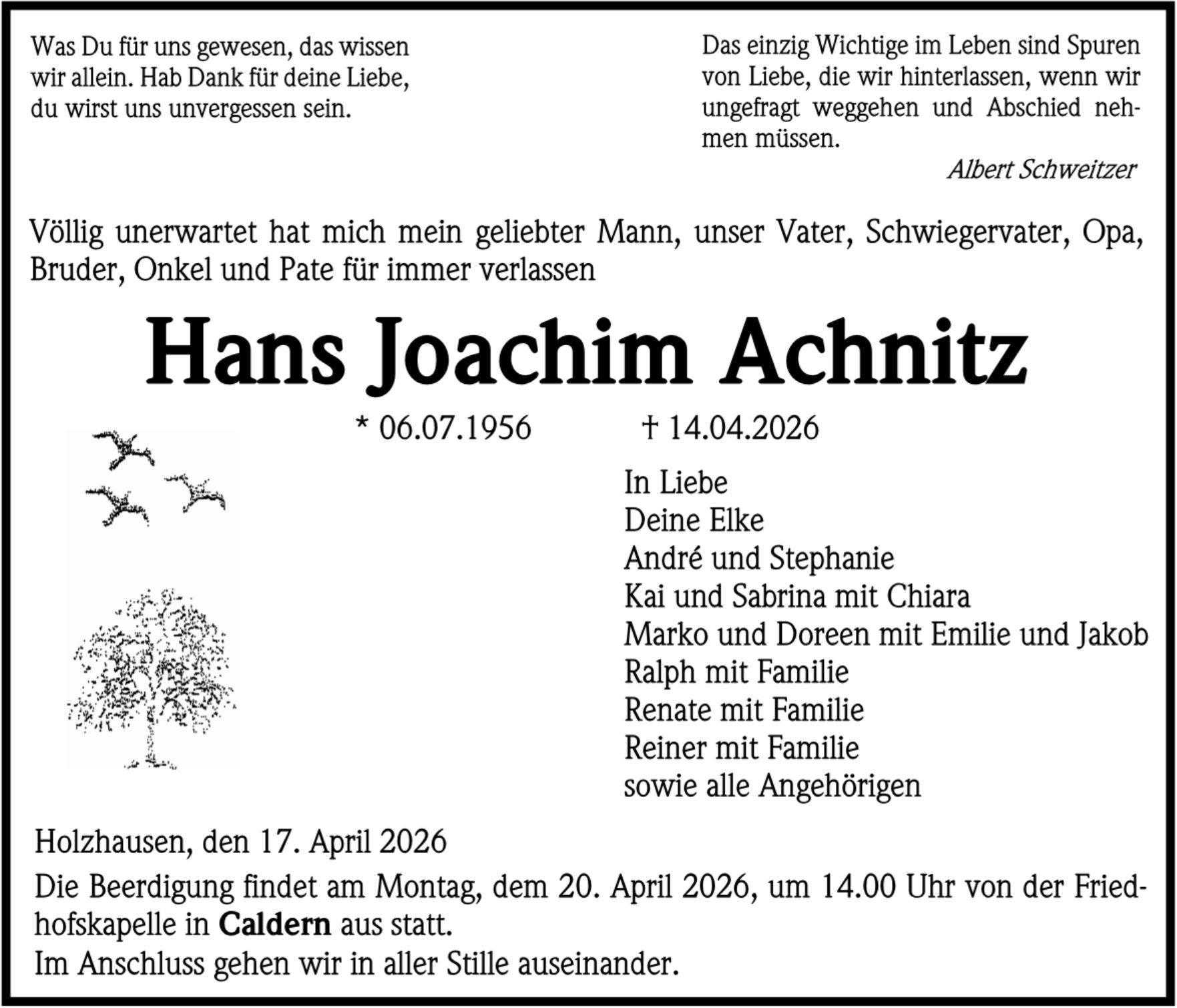 Die Beerdigung findet am Montag, dem 20. April 2026, um 14.00 Uhr von der Friedhofskapelle in Caldern aus statt.