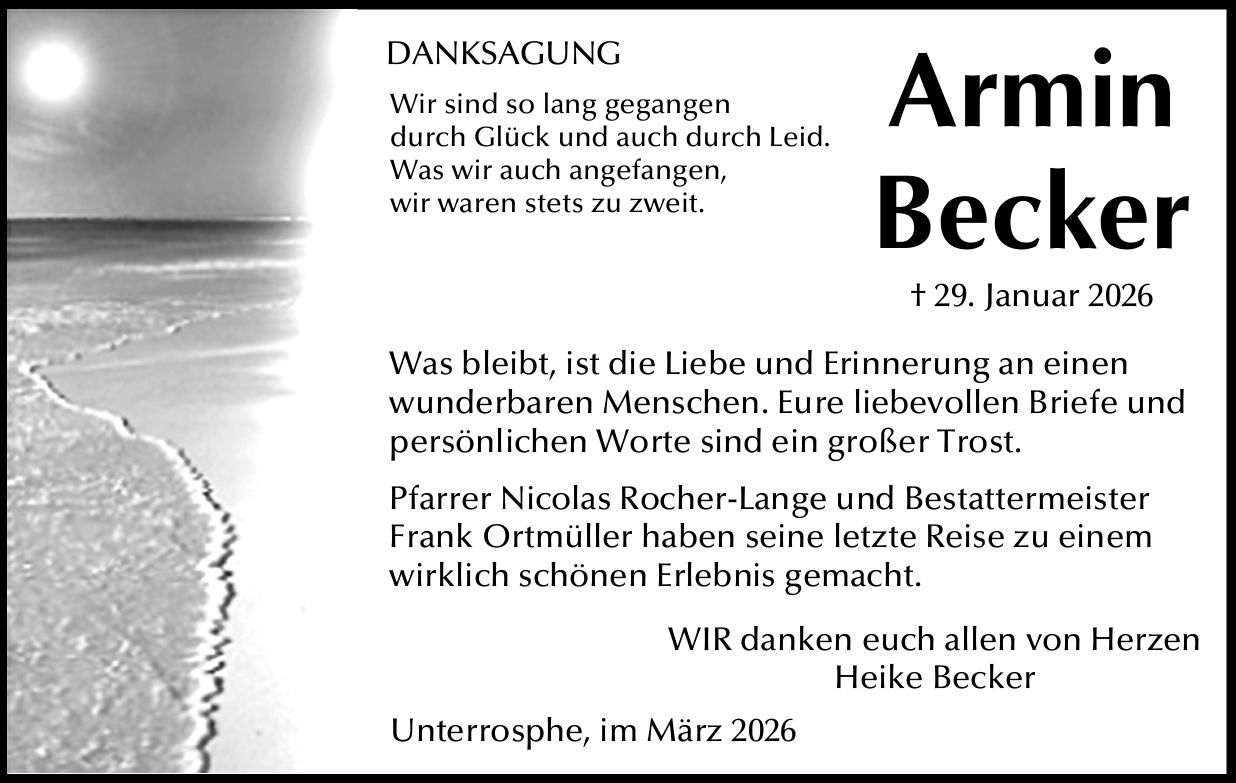 Die Trauerfeier mit anschließender Urnenbeisetzung findet am Dienstag, dem 17. Februar 2026, um 14.00 Uhr auf dem Friedhof in Unterrosphe statt.