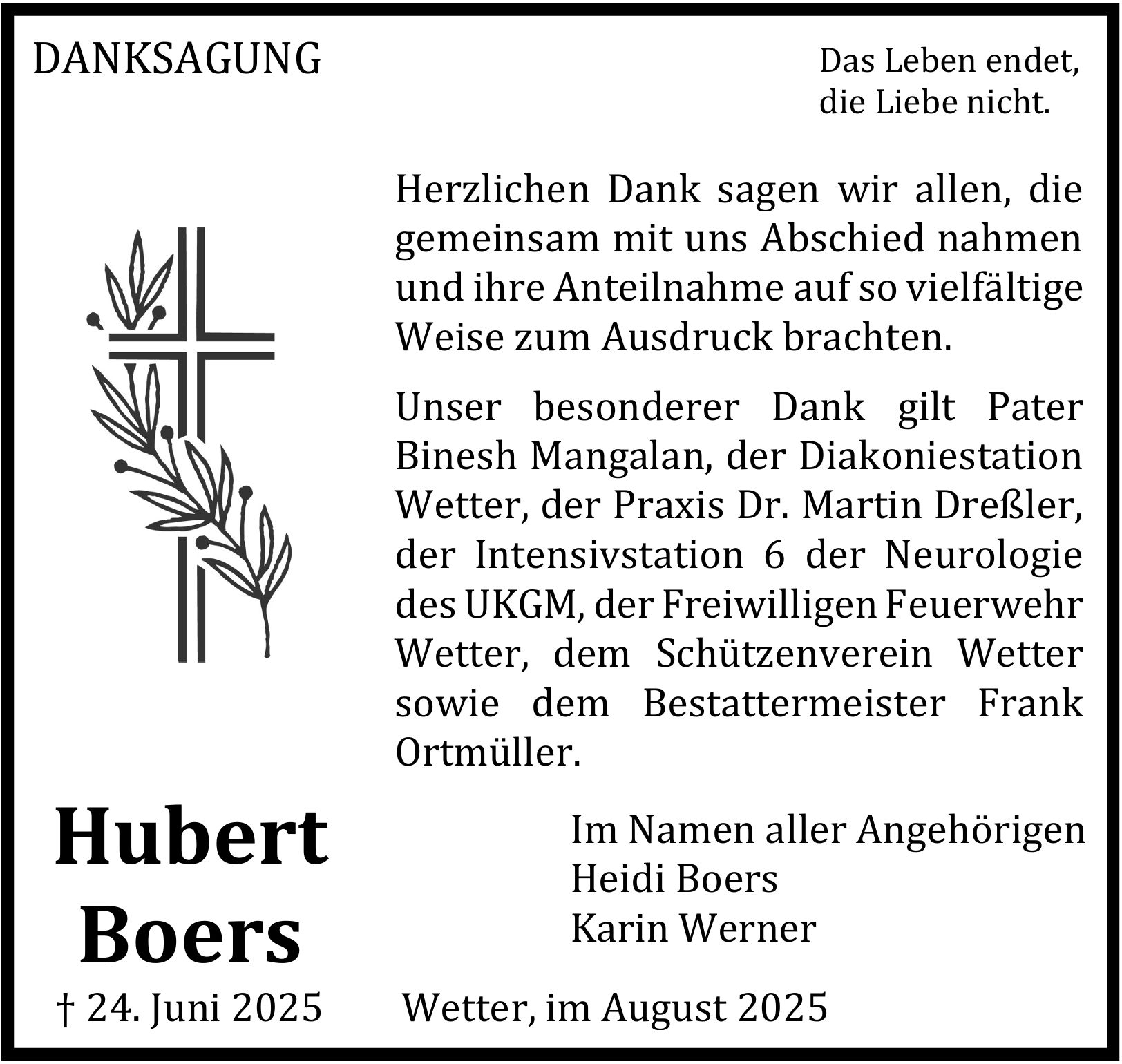 Die Beerdigung findet am Samstag, dem 28. Juni 2025 um 12.30 Uhr von der Friedhofskapelle in Wetter aus statt.