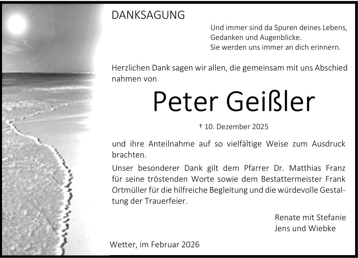 Anstelle von Blumen- und Kranzspenden bitten wir um eine Spende an die „Gemeinschaft Altenschlirf“ bei der Volksbank eG, IBAN: DE82 5006 9146 0001 0024 06, BIC: GENODE51GRC, Kennwort: „Trauerfall Peter Geißler“.