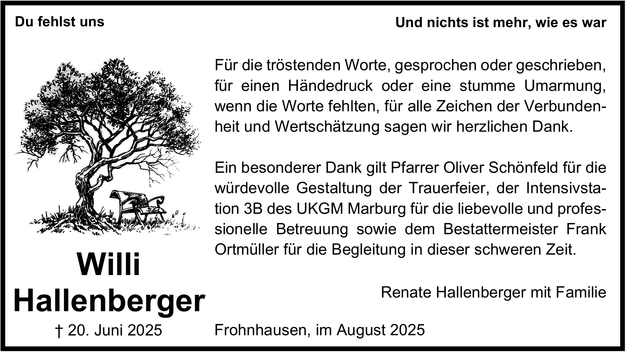 Die Trauerfeier mit anschließender Urnenbeisetzung findet am Dienstag, den 01. Juli 2025 um 14.30 Uhr von der Friedhofskapelle in Frohnhausen aus statt. Im Anschluss gehen wir in Stille auseinander.