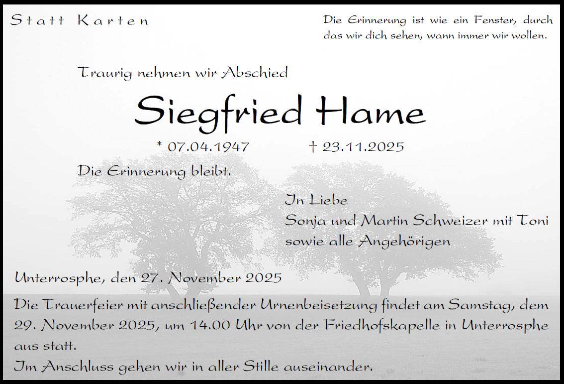Die Trauerfeier mit anschließender Urnenbeisetzung findet am Samstag, dem 29. November 2025, um 14.00 Uhr von der Friedhofskapelle in Unterrosphe aus statt.