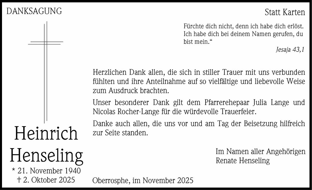 Die Urnenbeisetzung mit anschließender Trauerfeier findet am Dienstag, dem 14. Oktober 2025, um 14.00 Uhr von der Friedhofskapelle in Oberrosphe aus statt.