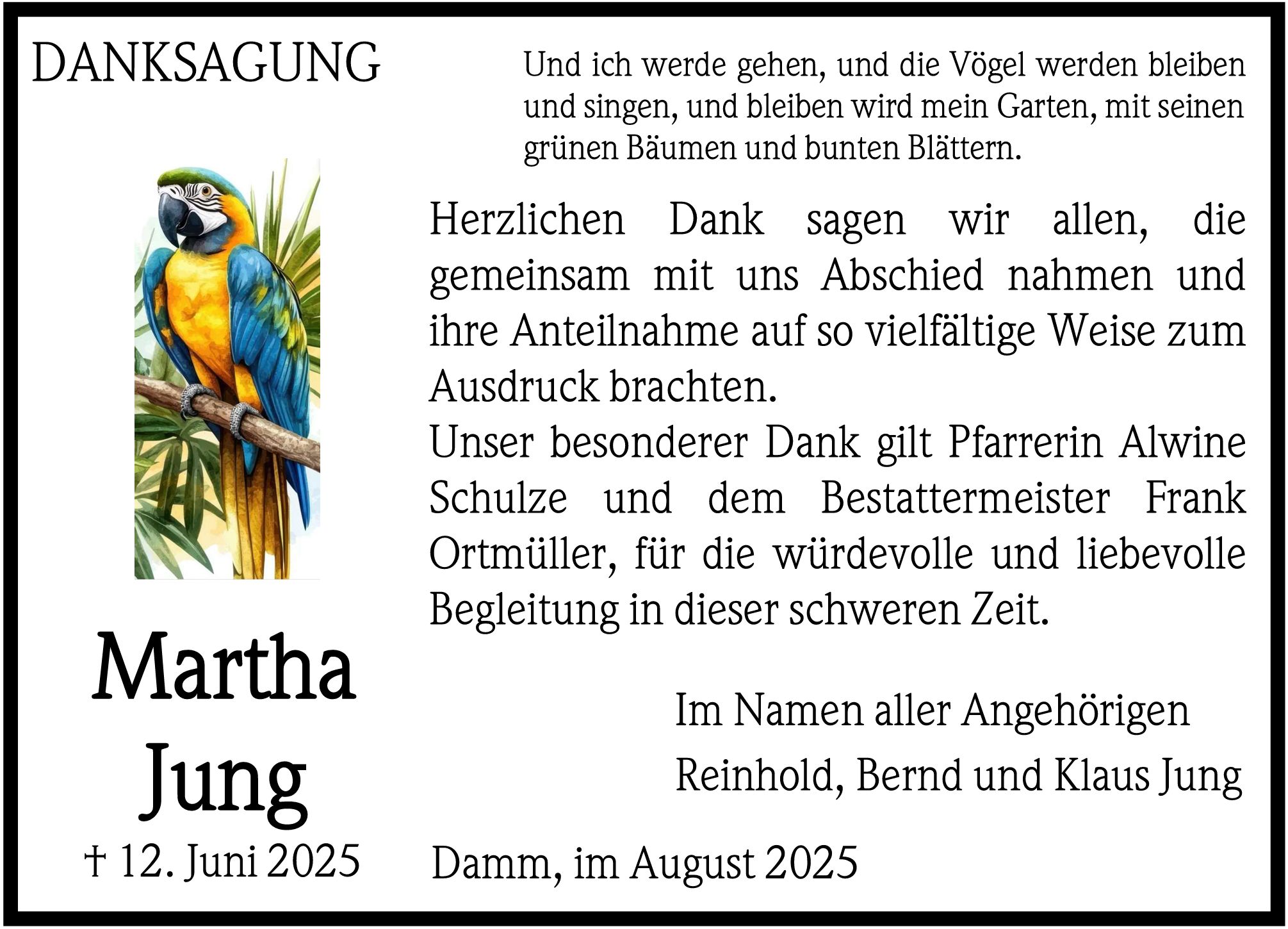 Die Trauerfeier mit anschließender Urnenbeisetzung findet am Freitag, dem 4. Juli 2025, um 14.00 Uhr von der Friedhofskapelle in Damm aus statt.