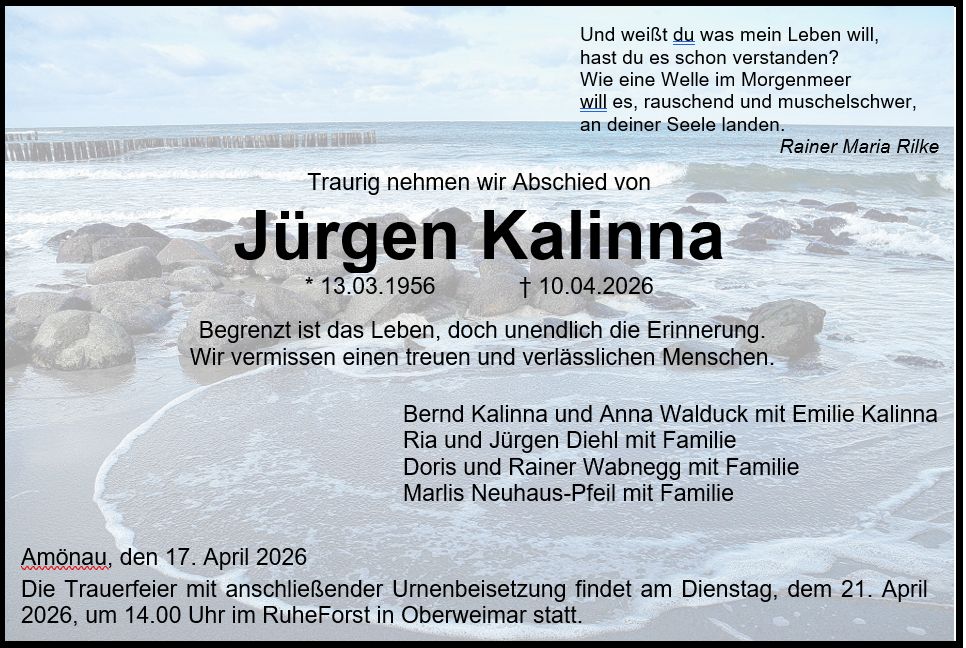 Die Trauerfeier mit anschließender Urnenbeisetzung findet am Dienstag, dem 21. April 2026, um 14.00 Uhr im RuheForst in Oberweimar statt.