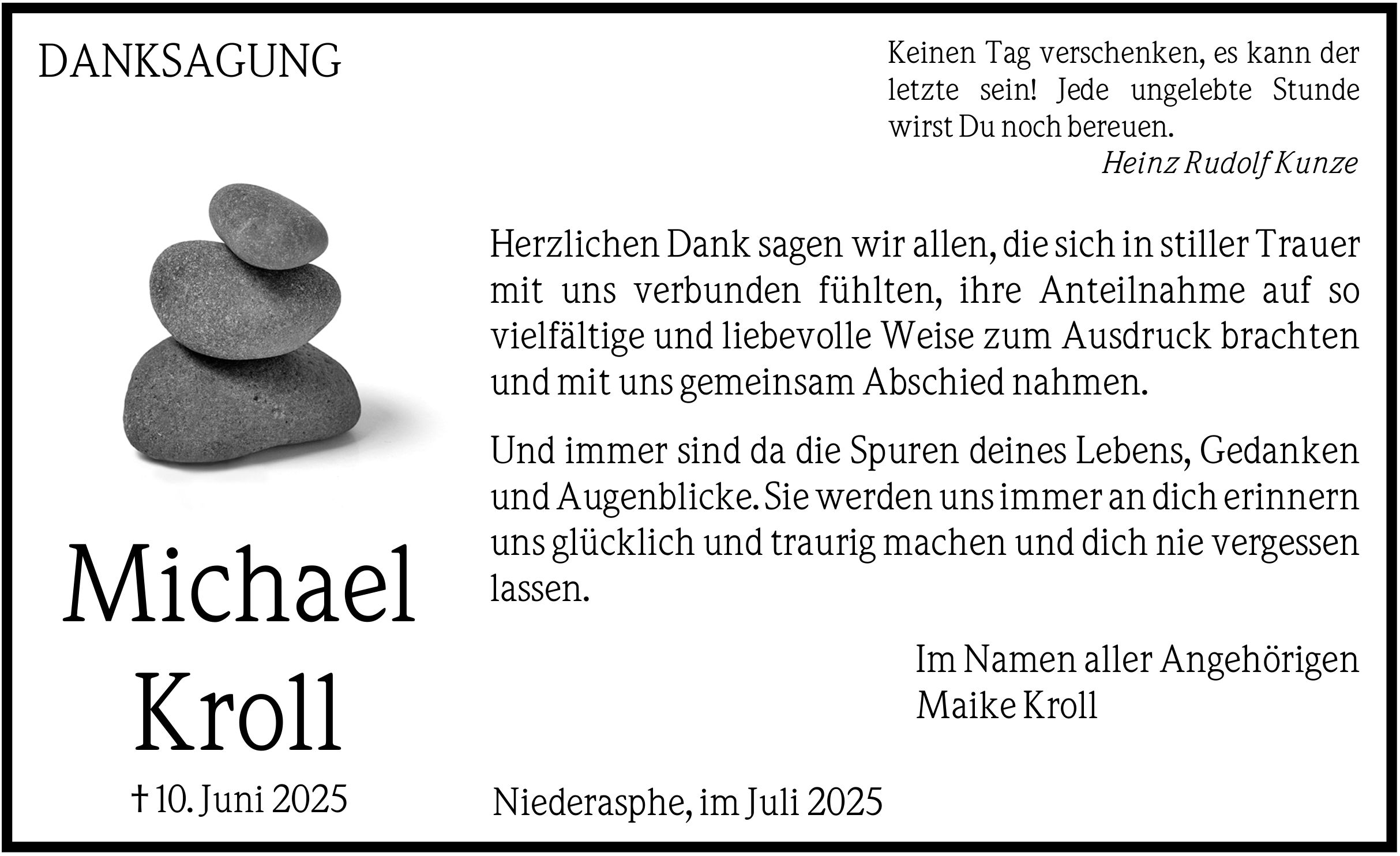 Die Trauerfeier mit anschließender Urnenbeisetzung findet am Freitag, dem 20. Juni 2025, um 14.00 Uhr von der Friedhofskapelle in Niederasphe aus statt.