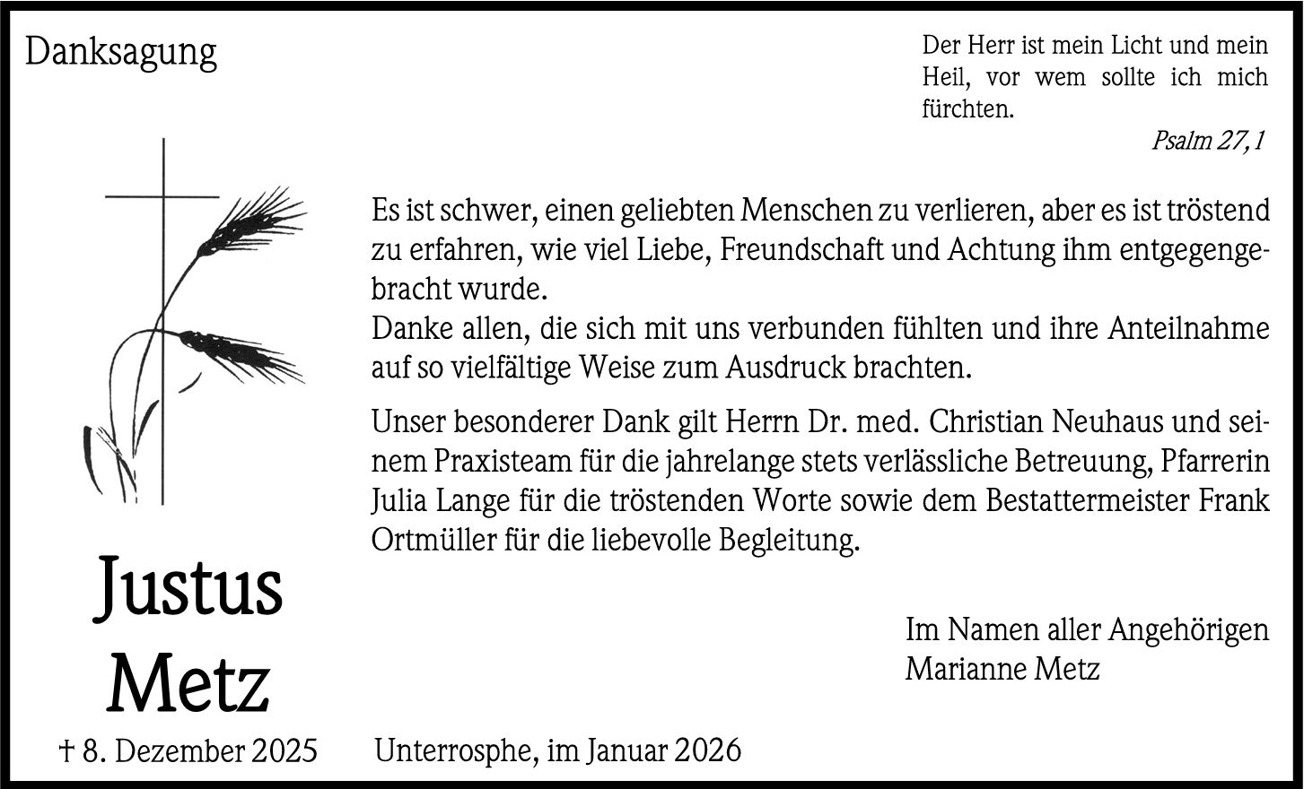 Die Trauerfeier mit anschließender Urnenbeisetzung findet am Dienstag, dem 16. Dezember 2025, um 14.30 Uhr von der Friedhofskapelle in Unterrosphe aus statt.