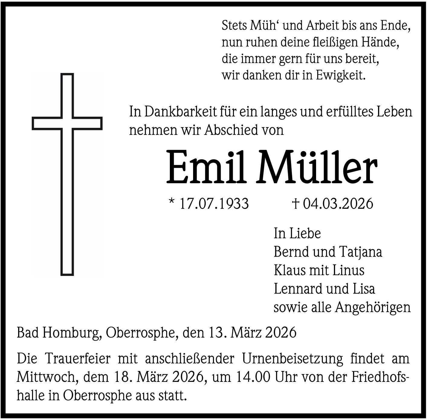 Die Trauerfeier mit anschließender Urnenbeisetzung findet am Mittwoch, dem 18. März 2026, um 14.00 Uhr von der Friedhofshalle in Oberrosphe aus statt.
