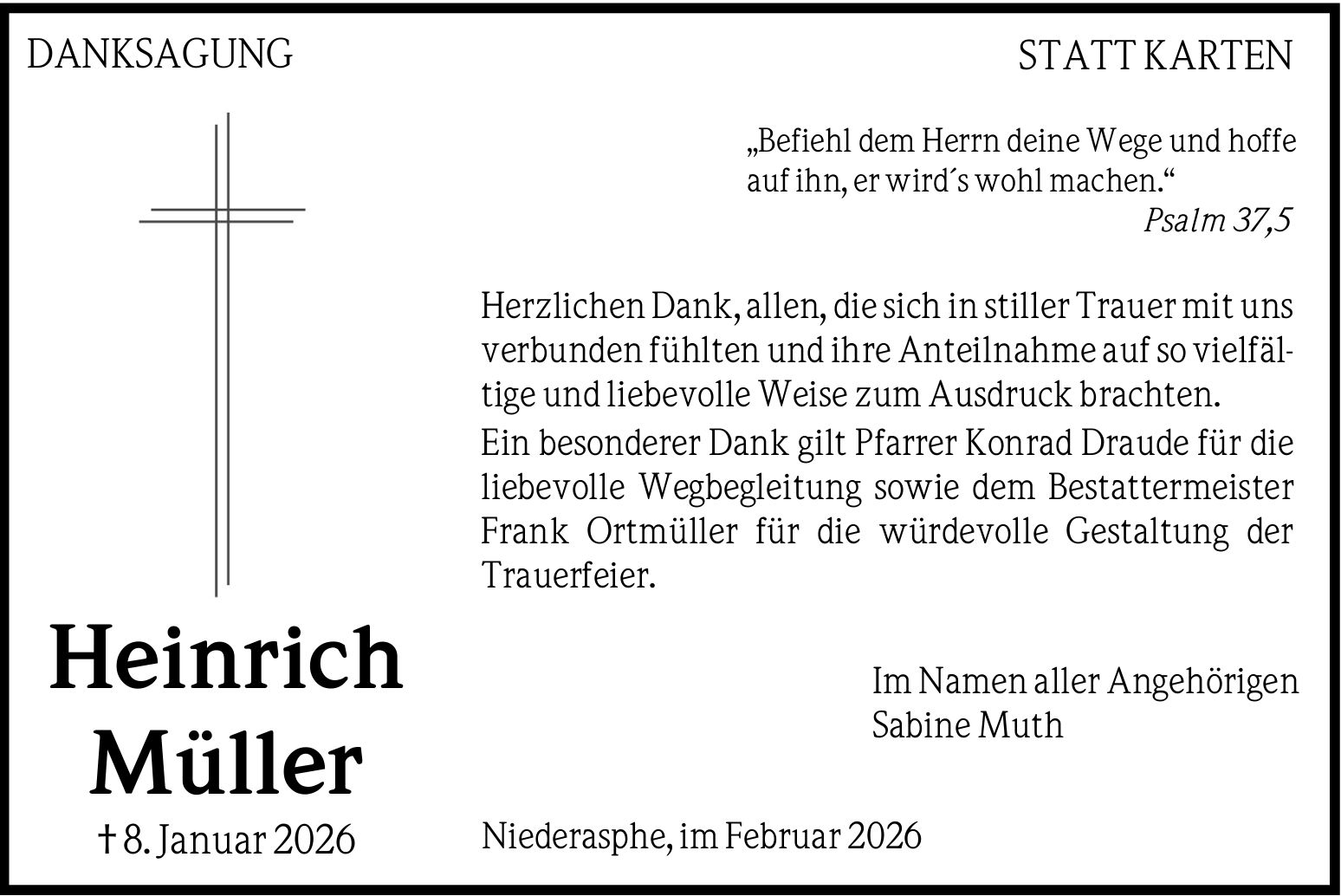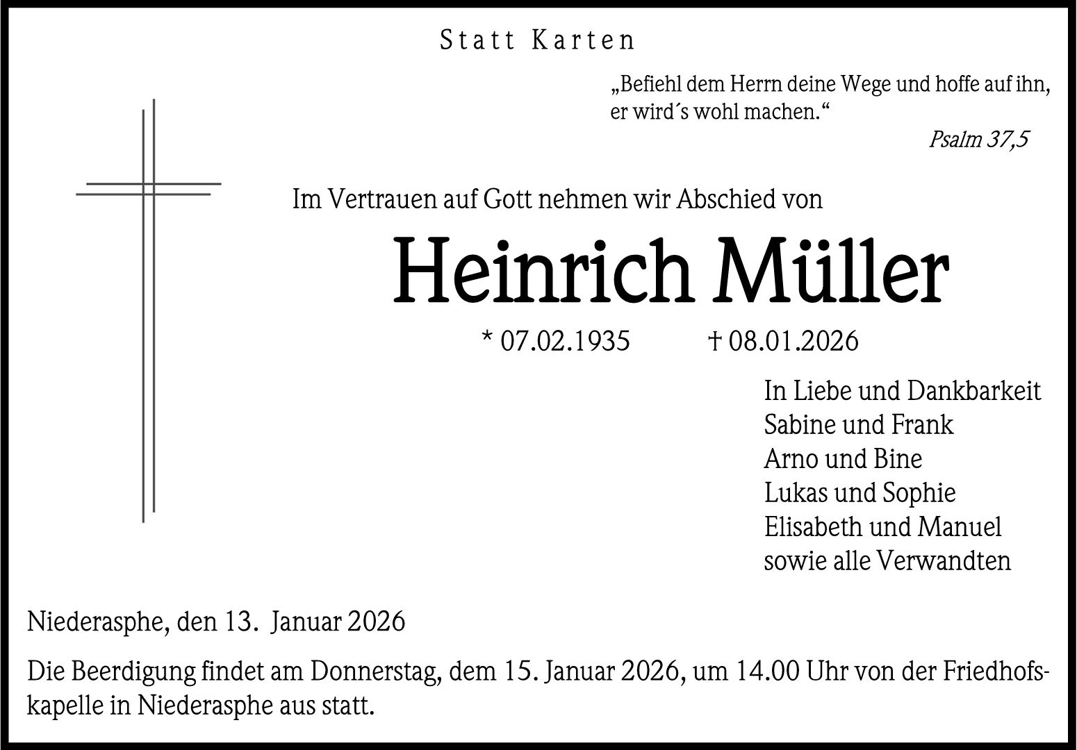 Die Beerdigung findet am Donnerstag, dem 15. Januar 2026, um 14.00 Uhr von der Friedhofskapelle in Niederasphe aus statt.