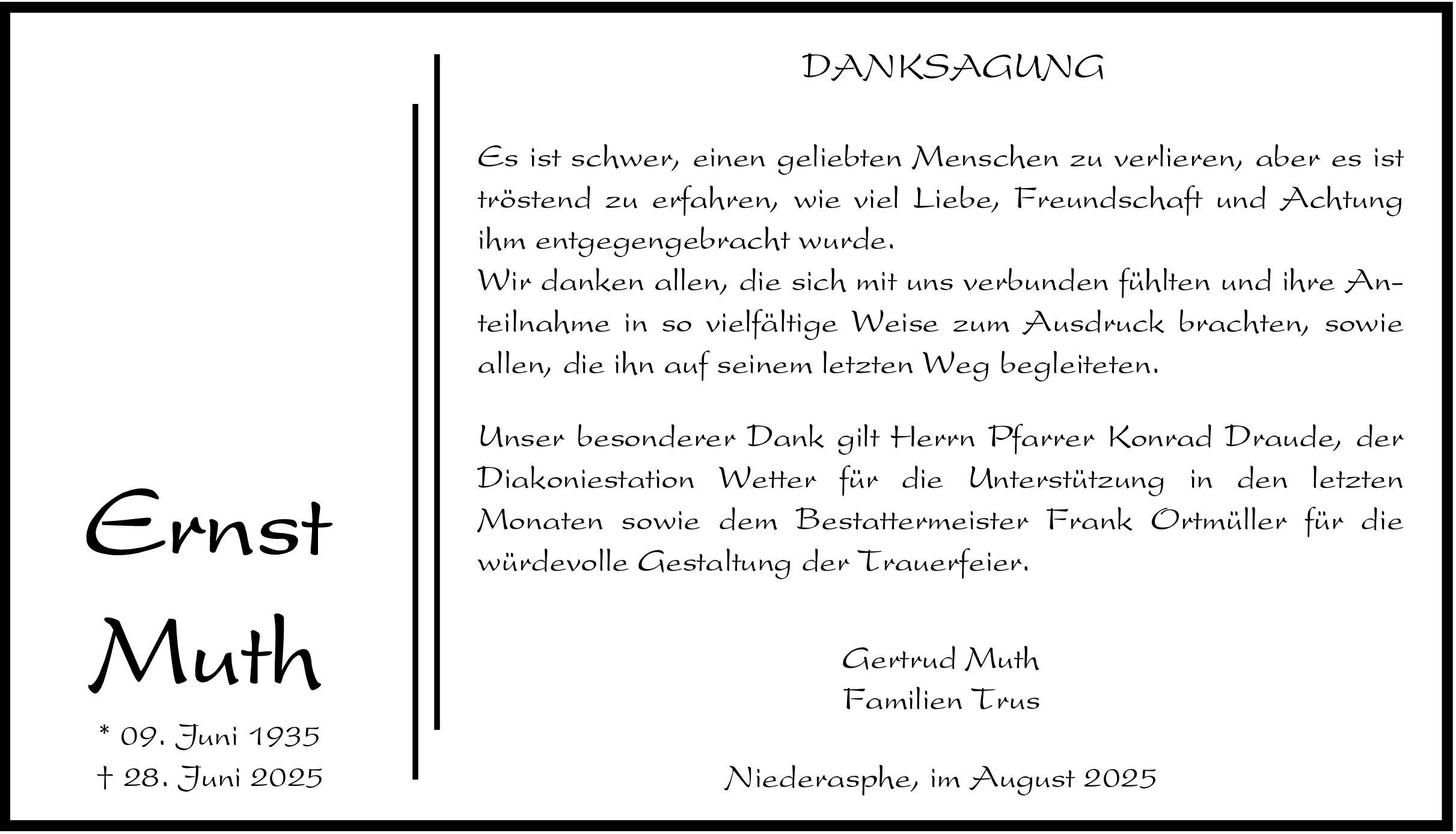Die Beerdigung findet am Donnerstag, dem 3. Juli 2025, um 14.00 Uhr von der Friedhofskapelle in Niederasphe aus statt.