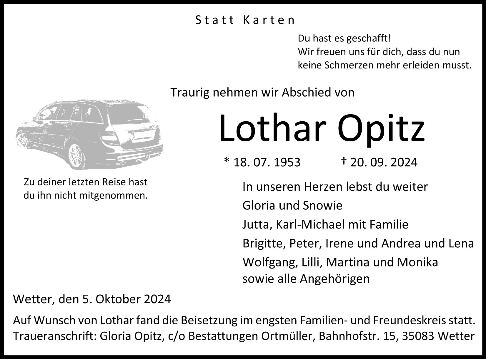 Auf Wunsch von Lothar fand die Beisetzung im engsten Familien- und Freundeskreis statt.