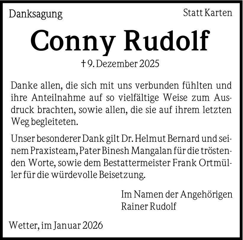 Die Trauerfeier mit anschließender Urnenbeisetzung findet am Samstag, dem 27. Dezember 2025, um 14.00 Uhr von der Friedhofskapelle in Wetter aus statt.