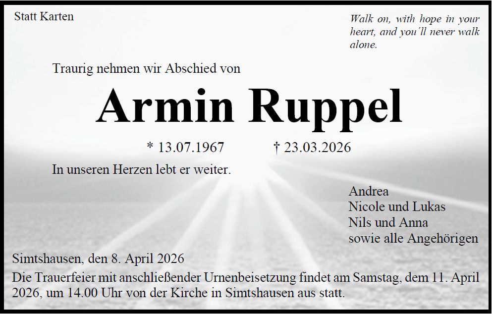 Die Trauerfeier mit anschließender Urnenbeisetzung findet am Samstag, dem 11. April 2026, um 14.00 Uhr von der Kirche in Simtshausen aus statt.