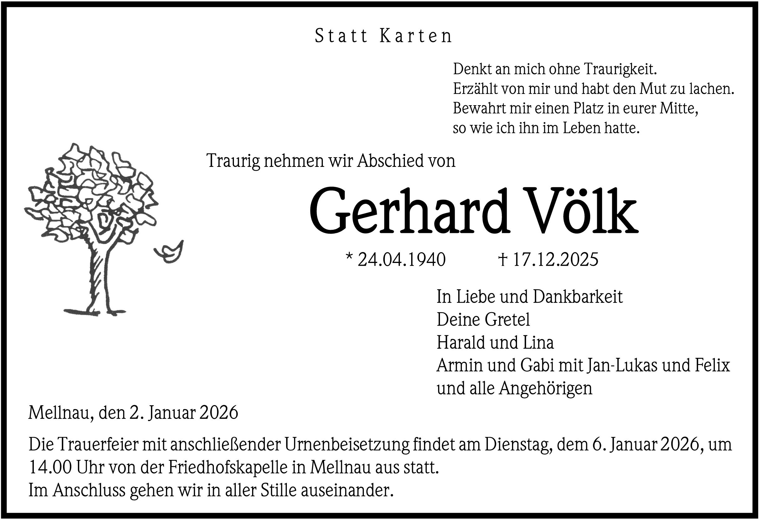 Die Trauerfeier mit anschließender Urnenbeisetzung findet am Dienstag, dem 6. Januar 2026, um 14.00 Uhr von der Friedhofskapelle in Mellnau aus statt.