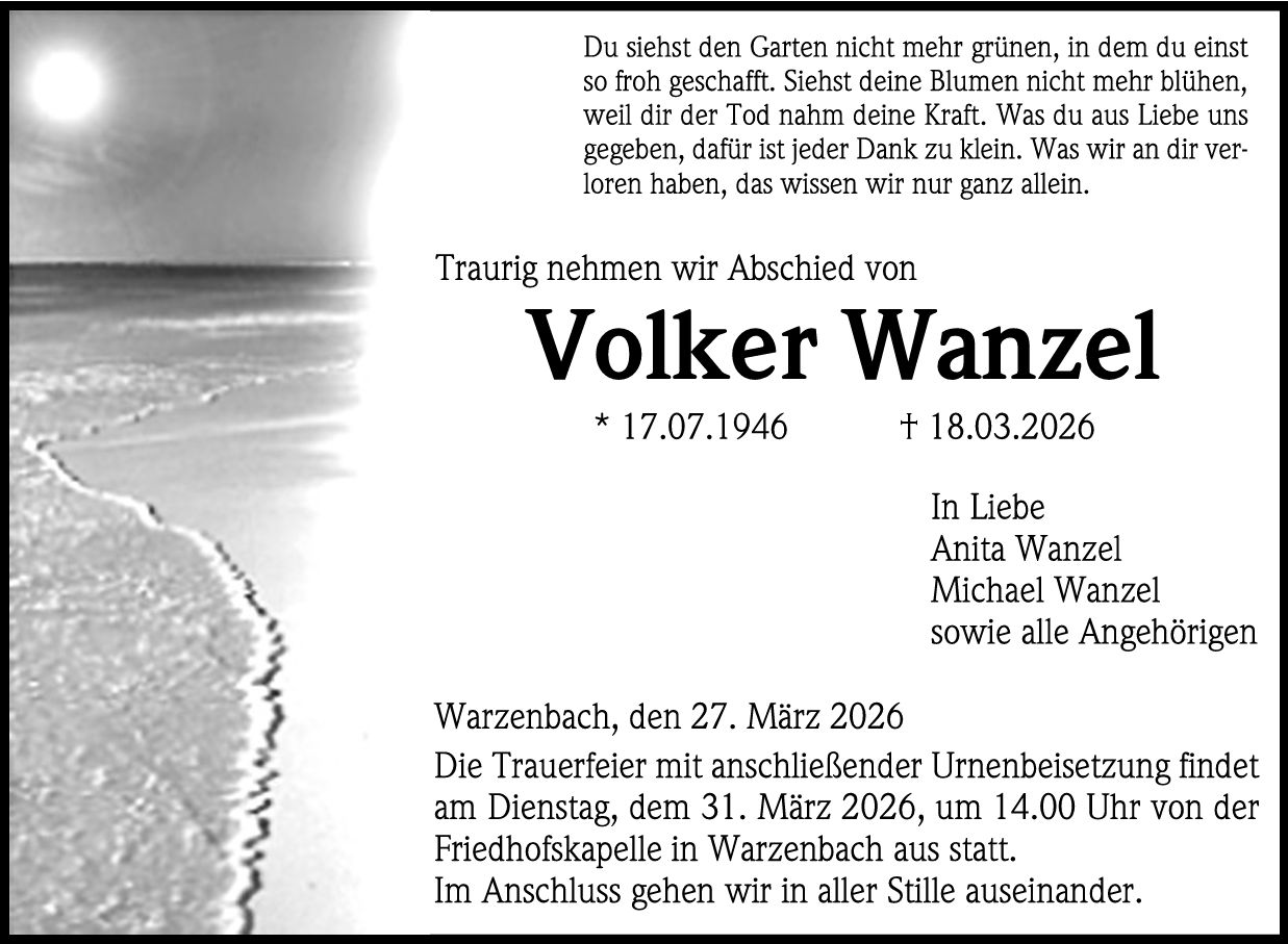 Die Trauerfeier mit anschließender Urnenbeisetzung findet am Dienstag, dem 31. März 2026, um 14.00 Uhr von der Friedhofskapelle in Warzenbach aus statt.
